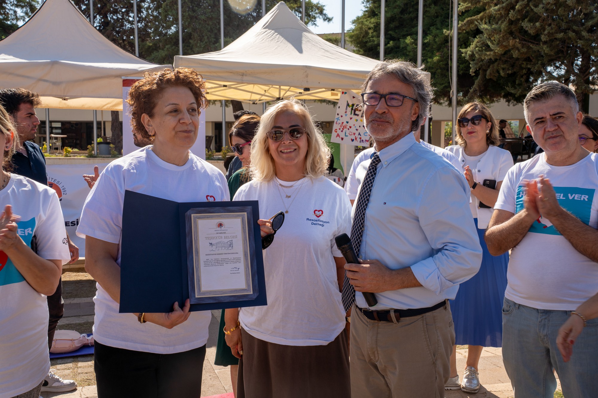Etkinlik sonunda Resüsitasyon Derneği Başkanı Prof. Dr. Şule Akın tarafından Üniversitemize otomatik eksternal defibrilatör cihazı hediye edildi. Rektör Yardımcımız Prof. Dr. Ahmet Hakan Öztürk ise Dernek Başkanı Prof. Dr. Şule Akın’a teşekkür belgesi takdim etti.
